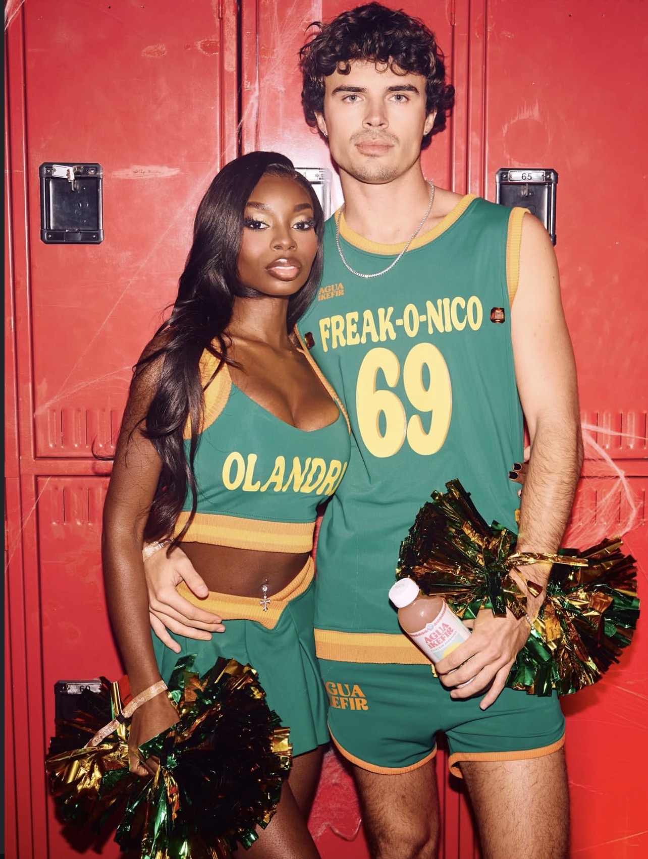 Nic channeled playful confidence in his “Freak-O-Nico 69” basketball jersey and shorts, while Olandria radiated school-spirit glam in her custom “OLANDRIA” cheer uniform — both designed in the Agua de Kefir brand colors of green and gold. Together, they looked like the Homecoming King and Queen of a universe that only exists in pop-culture dreams.